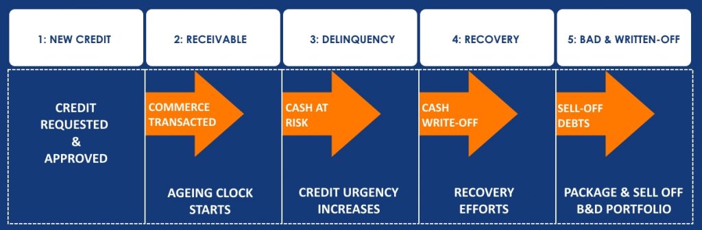The illustration above requires explanation of the (5) stages that a company or financial institution has to manage in order to secure or retain new and existing customers and recover what is due to them. Those stages are: